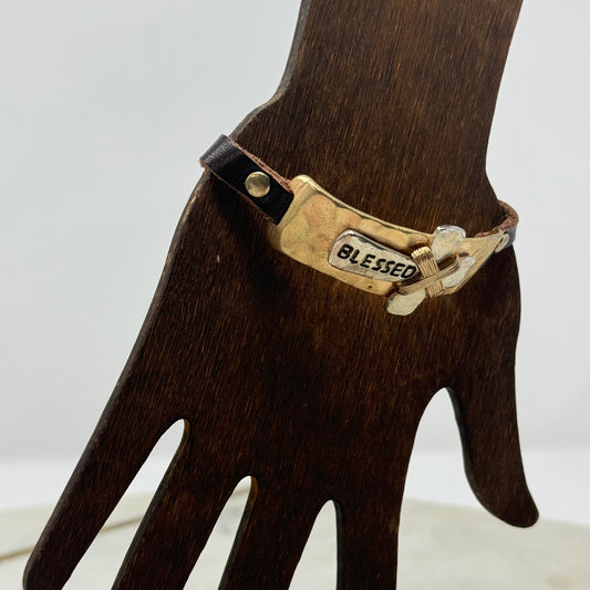 Bracelet Boho Brown Leather Gold Tone Affirmation Cross Blessed Bangle 9.25 in