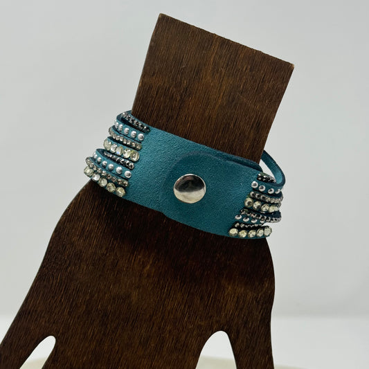 Bracelet Boho Southwest Layer Blue Faux Leather Rhinestone Cuff 9.25 in