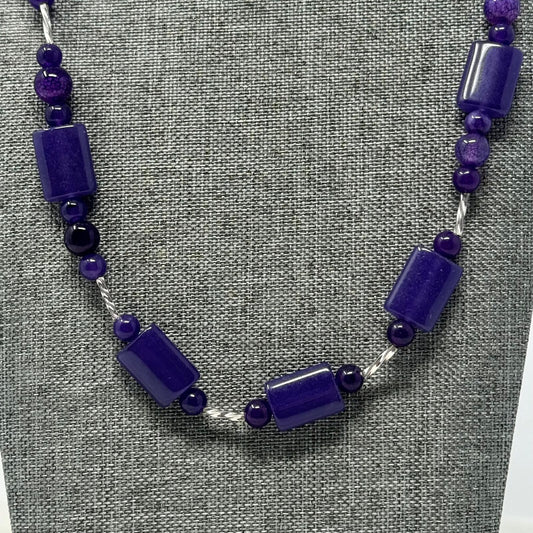 Purple Beaded Bib Necklace Cyndrical, Round, Multi Shade Smooth Glass Beads Elegant 20”