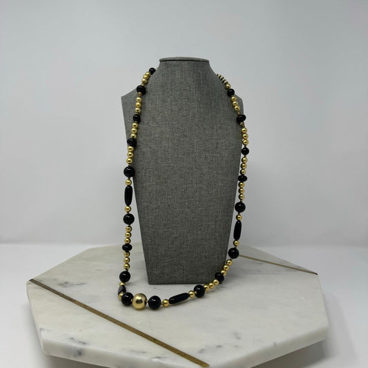 Black & Gold Beaded Statement Necklace Elegant Minimal Timeless Chic Glass 32”