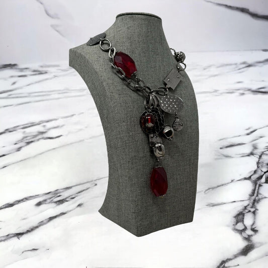 Bijoux Terner Red Statement Necklace Black Gun Metal Chain Bold Faceted Accent 24”