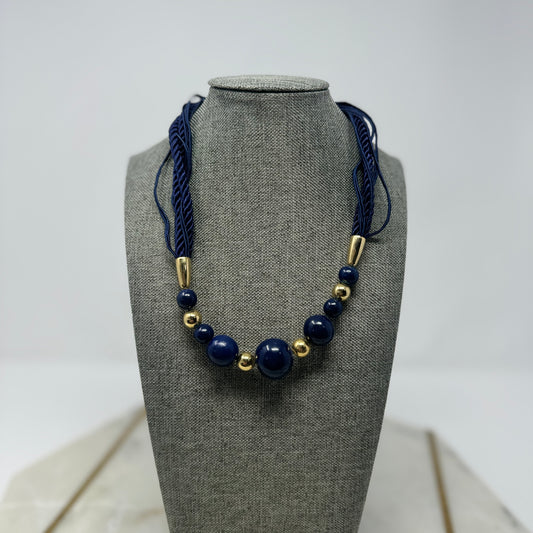 Elegant Blue & Gold Beaded Necklace with Multi-Strand Rope - Modern Statement Jewelry