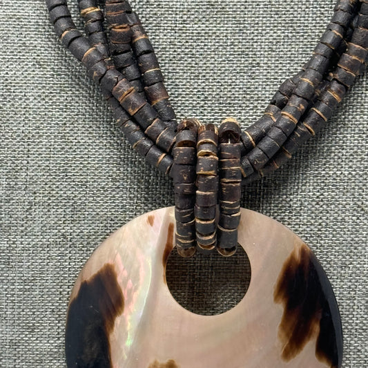 Boho Brown Beaded Necklace Large Shell Pendant Multi-Strand Brown Handmade Statement Jewelry