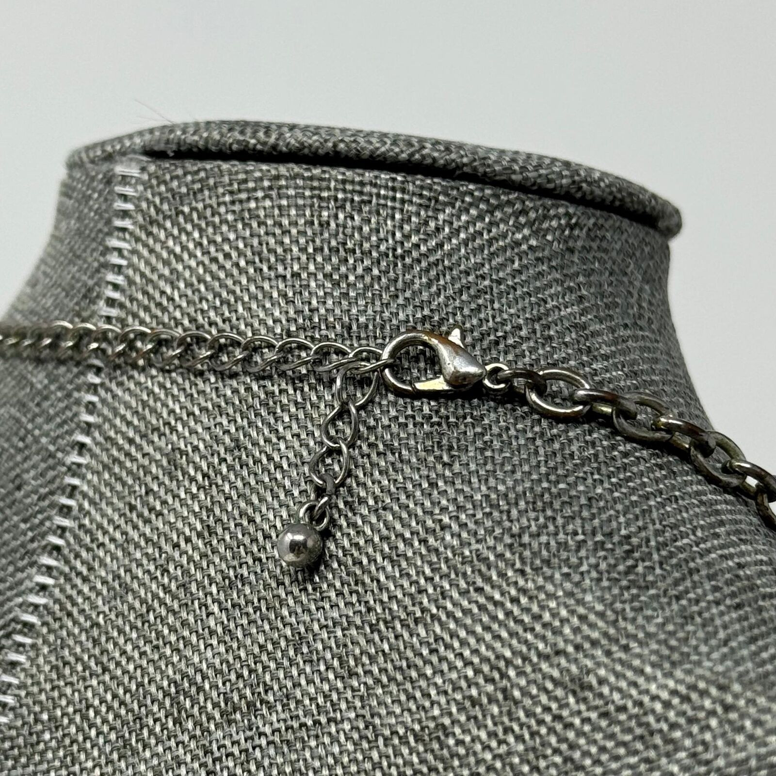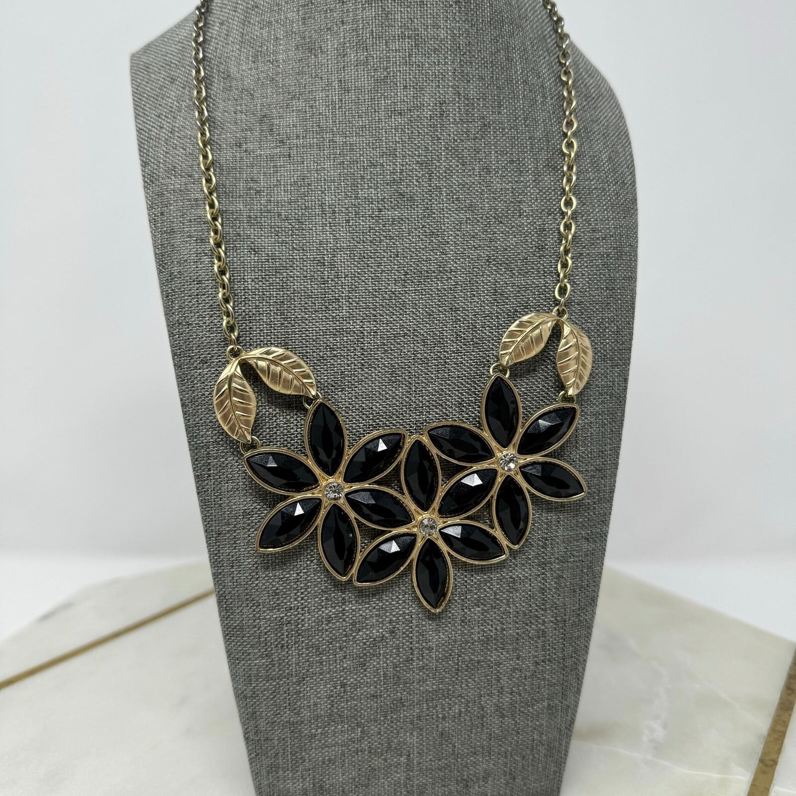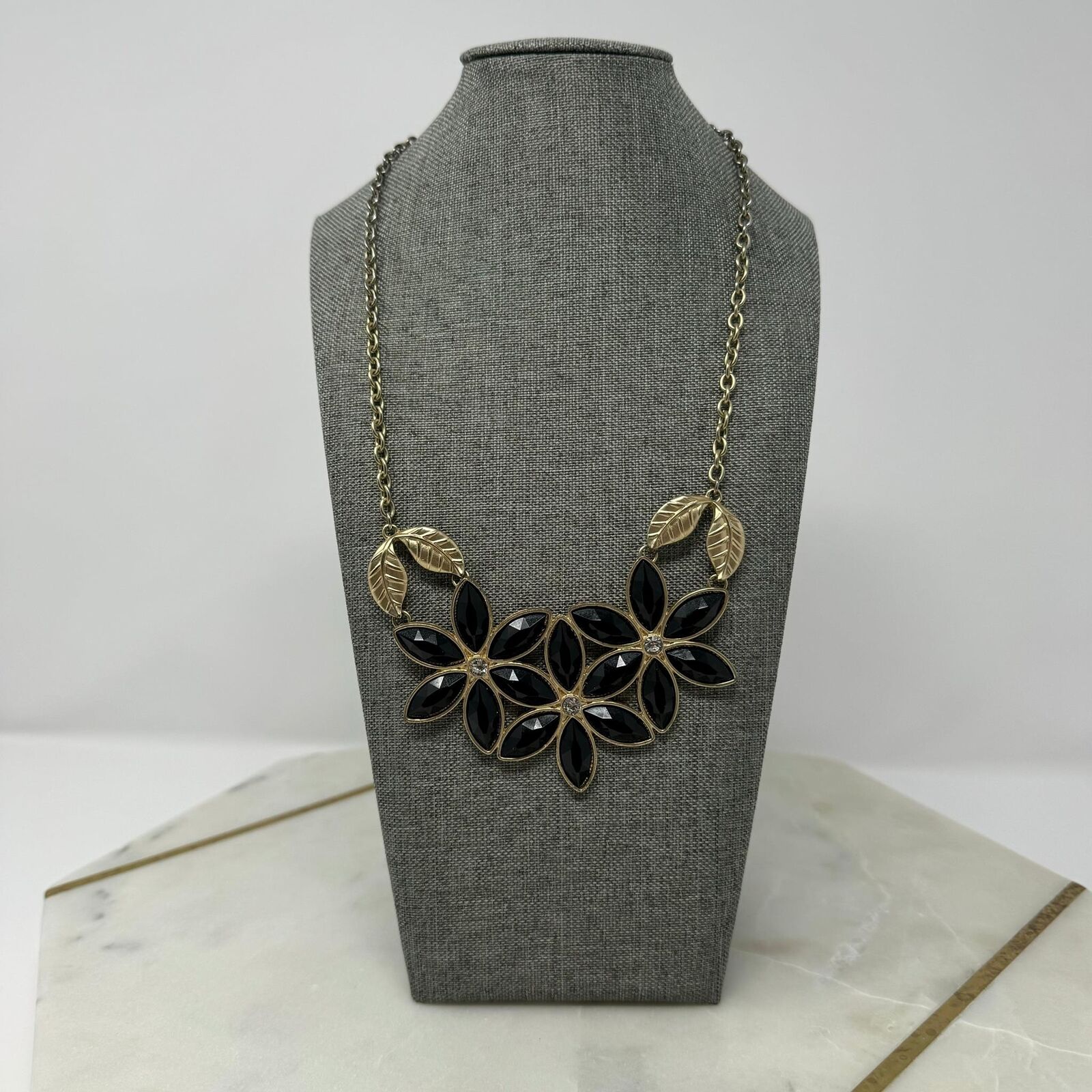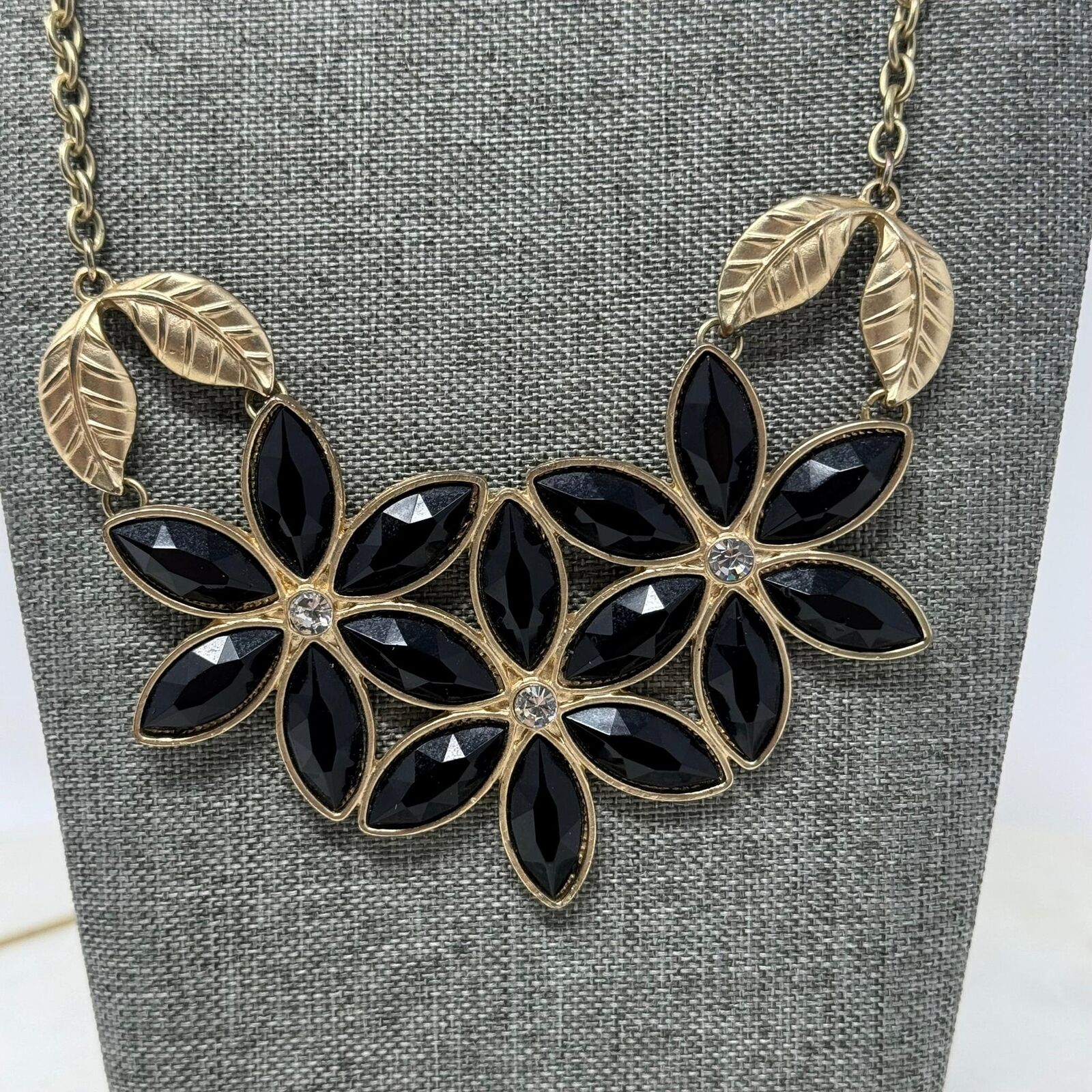 Black Floral Statement Necklace Gold Chain Leaf Faceted Accent Petal Elegant 16”