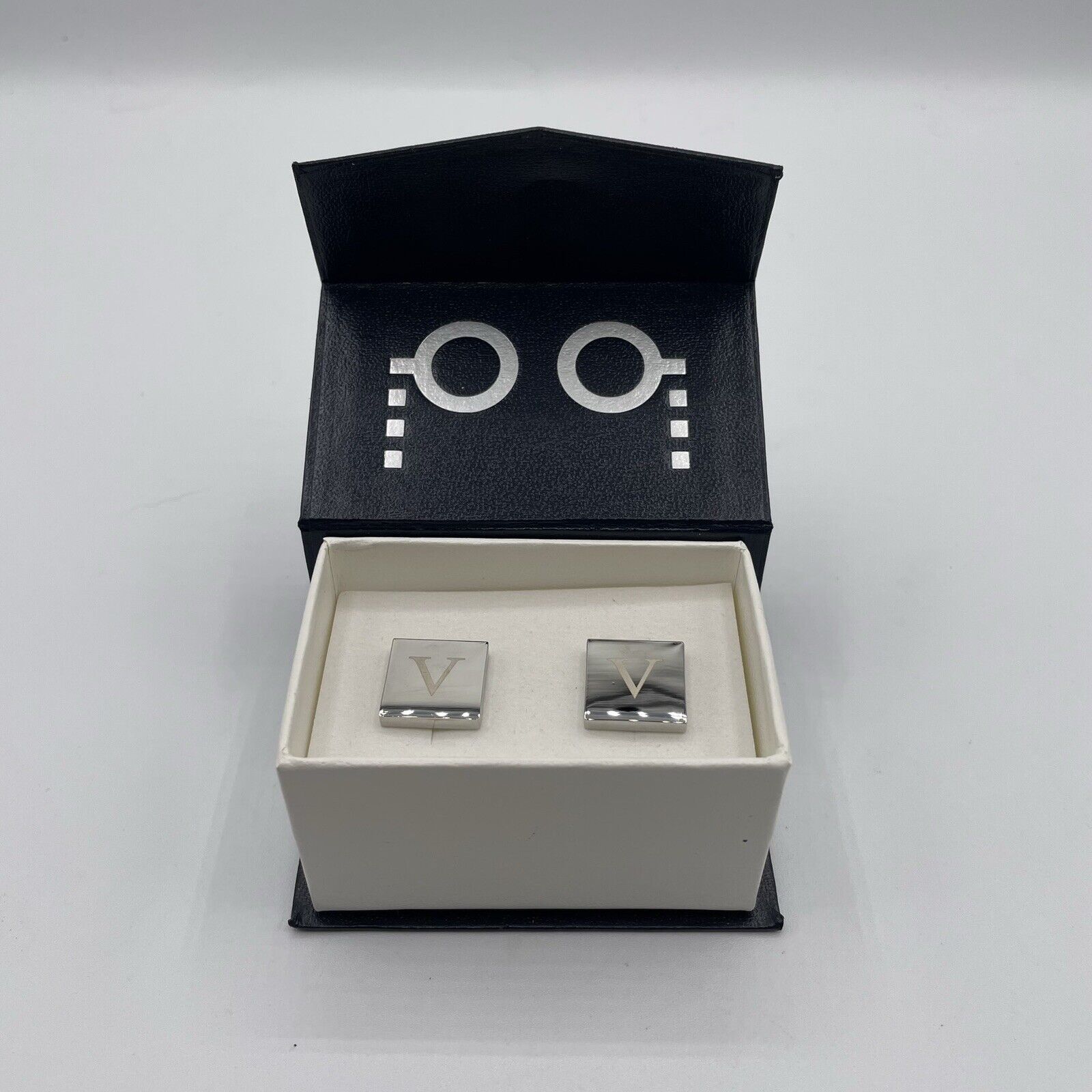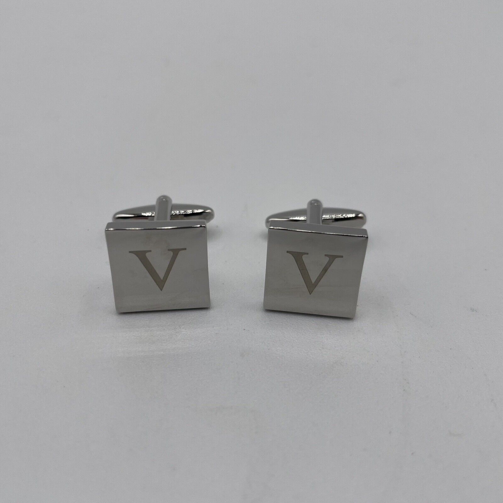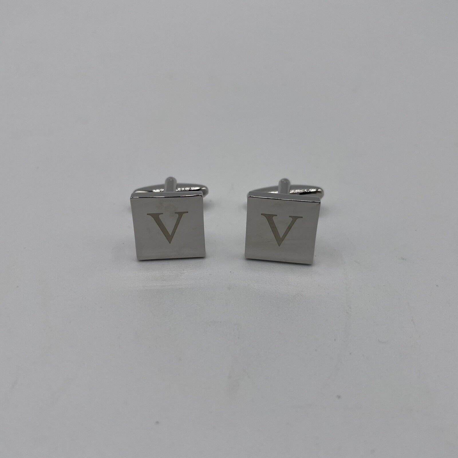 Make a statement with these stylish cufflinks featuring an initial letter "V" monogram. The sleek design showcases a square shape with chrome features, perfect for special occasions such as weddings, graduations, and Father's Day. Crafted from high-quality stainless steel, these cufflinks by Dual Monocle are both durable and fashionable.