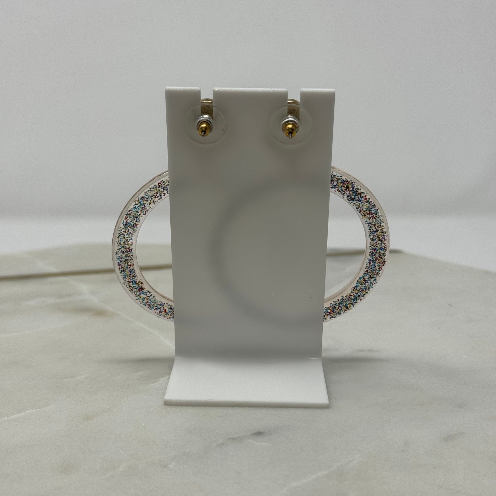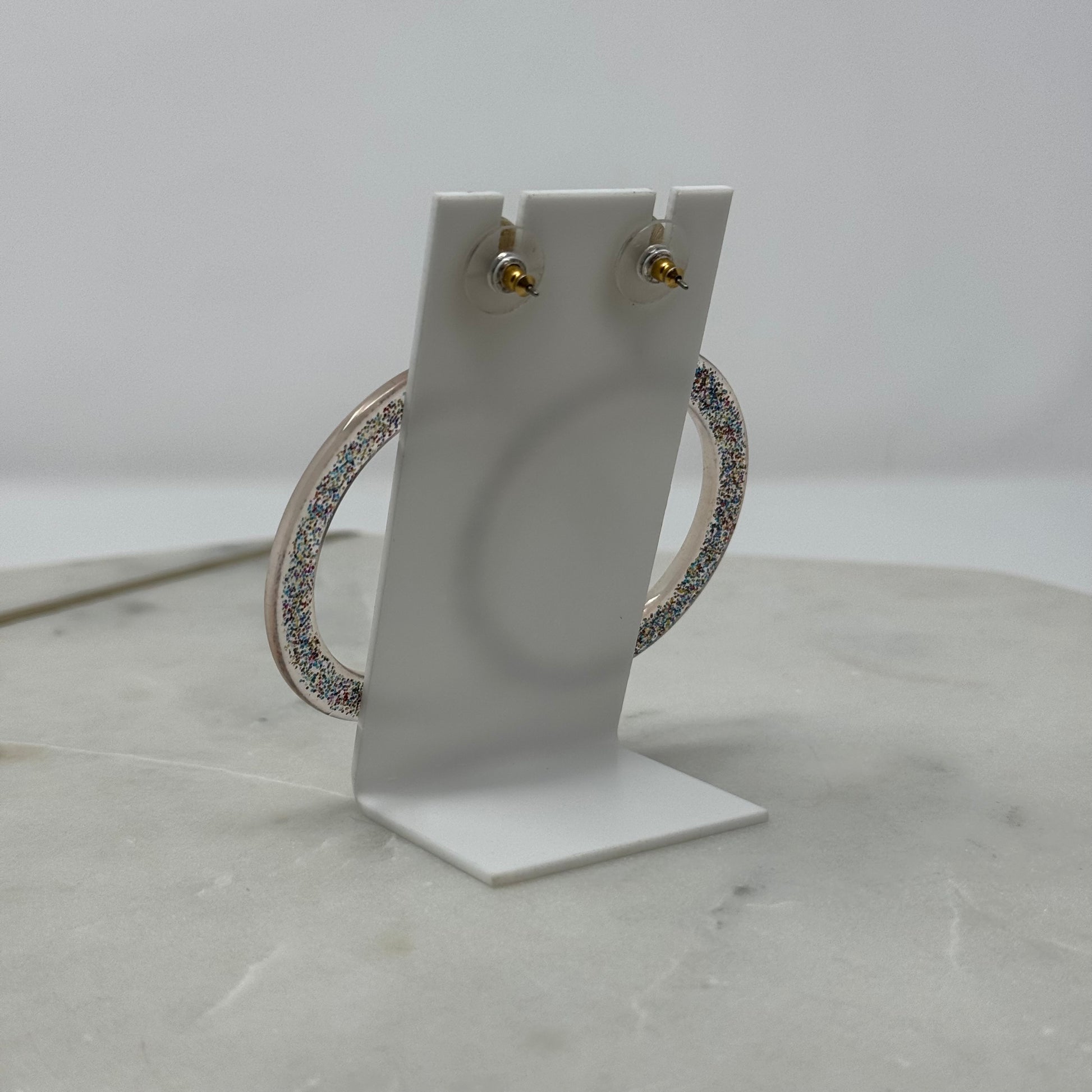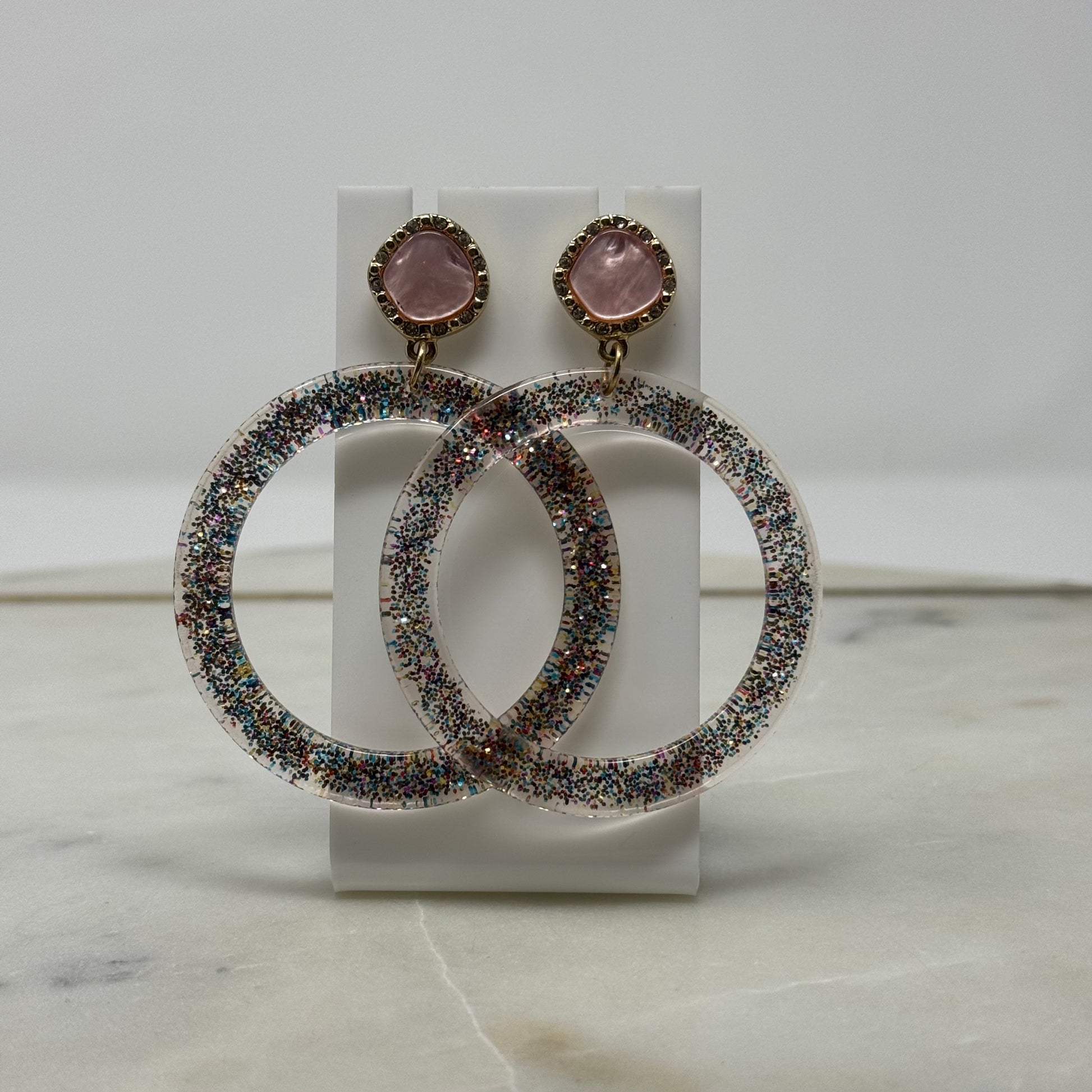 Add a touch of chic to your wardrobe with these Pink & Gold Glitter Dangle Hoop Earrings. These beautiful earrings shimmer in the light, making you stand out and sparkle wherever you go. Perfect for adding a little glam to any outfit.