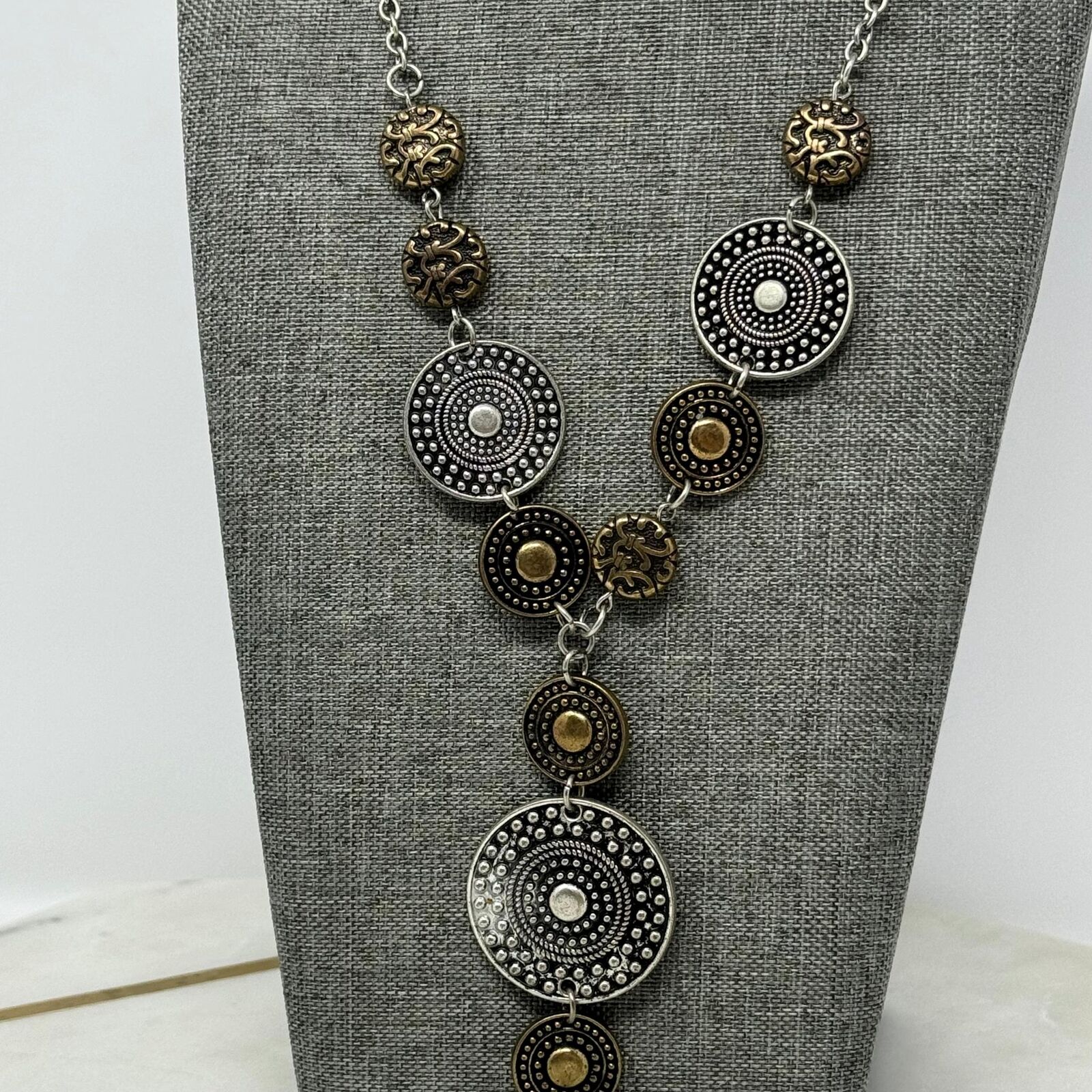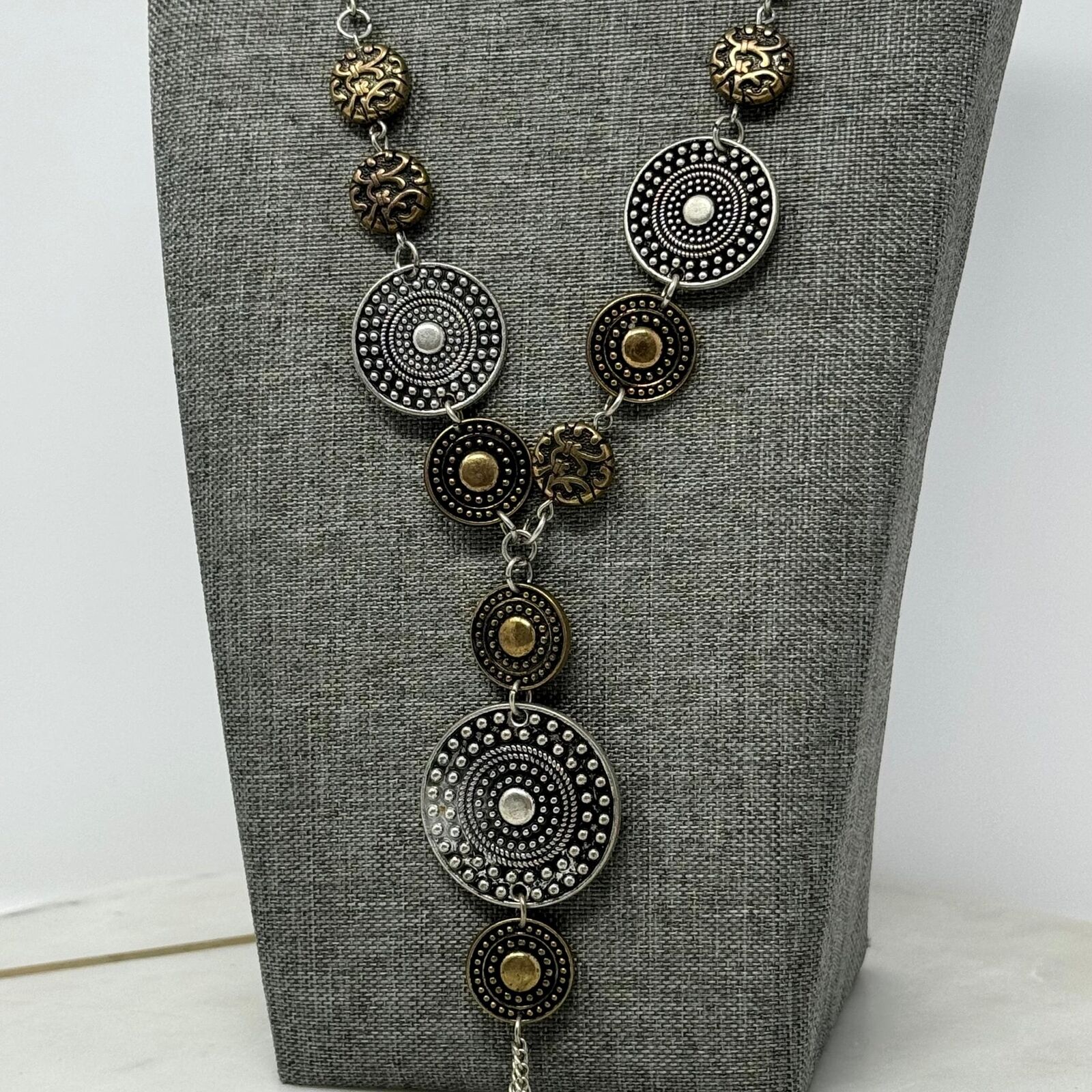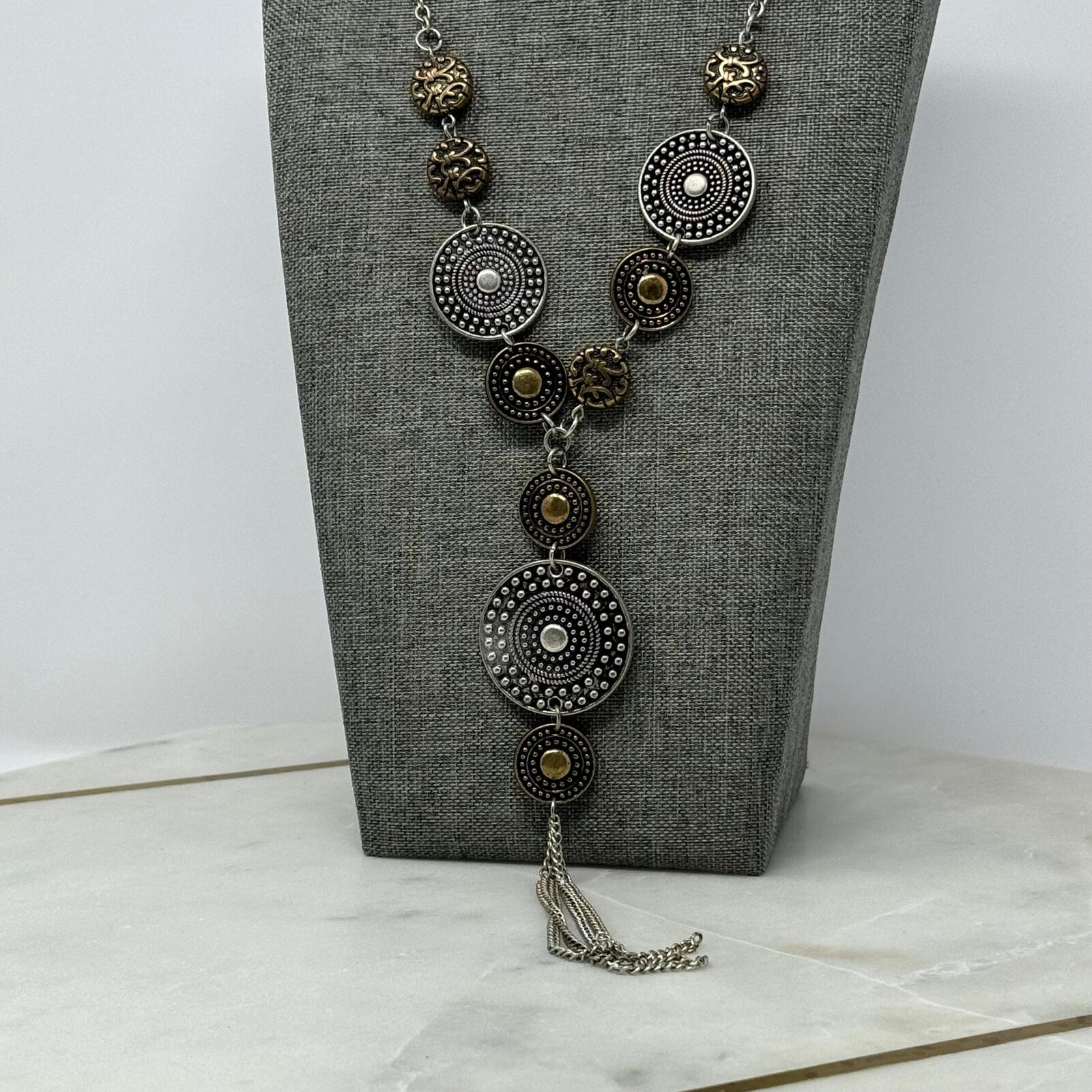 Tribal TwoTone Lariat Necklace Silver Brass Textured Intricate Medallions Tassel 20”